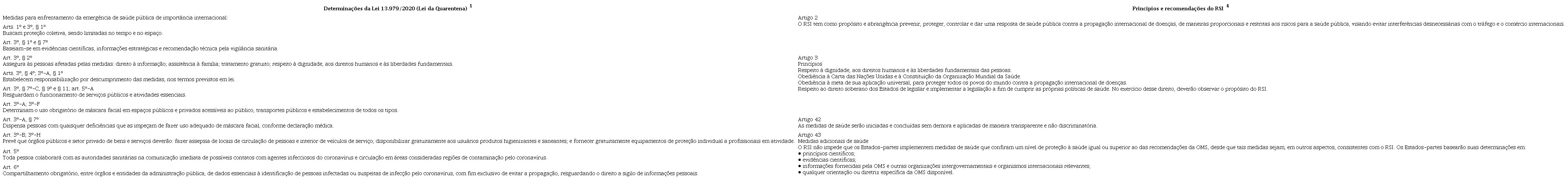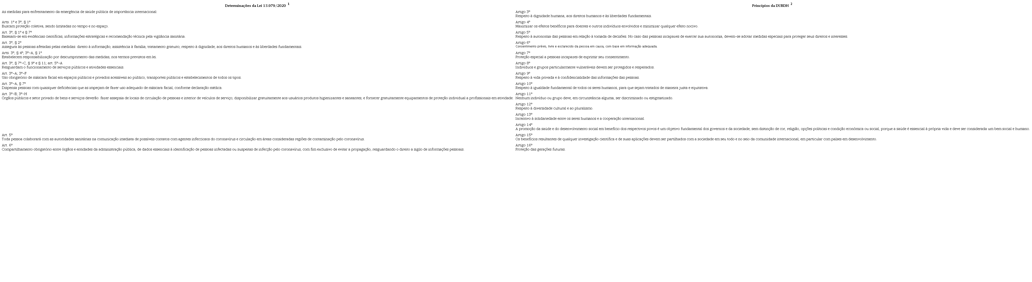 Nota-se que os princípios da DUBDH 2 permeiam toda a Lei 13.979/2020 1 , não sendo possível traçar uma linearidade entre os artigos e princípios, pois ambos são multidimensionais. Alguns artigos exibem uma relação mais forte com princípios específicos, como o art. 3º, § 2º, da Lei 13.979/2020, e o art. 3º da DUBDH, que versam sobre respeito à dignidade humana e contra abusos e ilegalidades de restrições; e o art. 3º, § 7º, e o art. 5º da DUBDH sobre autonomia e pessoas vulneráveis.