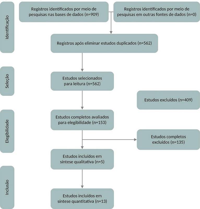 Vale ressaltar que não houve restrição de data de publicação. A busca foi realizada em novembro de 2019, e a seleção, leitura e análise dos textos ocorreram entre os meses de janeiro de 2019 e janeiro de 2020. Apreendeu-se um total de 909 artigos, removendo-se 347 textos duplicados, restando 562, que foram submetidos à leitura de títulos e resumos, para selecionar aqueles que atendiam aos critérios de inclusão estabelecidos.