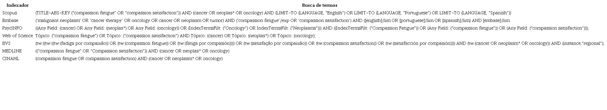 O levantamento bibliográfico foi realizado na Biblioteca da Escola de Enfermagem da Universidade de São Paulo (USP) com auxílio de um bibliotecário. Utilizaram-se as seguintes bases de dados: CINAHL (112 artigos); Embase (149 artigos); Web of Science (172 artigos); PsycINFO (50 artigos); Scopus (144 artigos); PubMed (168 artigos) e Biblioteca Virtual em Saúde (BVS) (114 artigos). Optou-se por utilizar os seguintes descritores de ciências em saúde (DeCS) e medical subject headings (MeSH): “ compassion fatigue ”; “ compassion satisfaction ”; “ oncology ”; “ cancer ” e “neoplasia”, associados pelos operadores booleanos “ and ” e “ or ”.