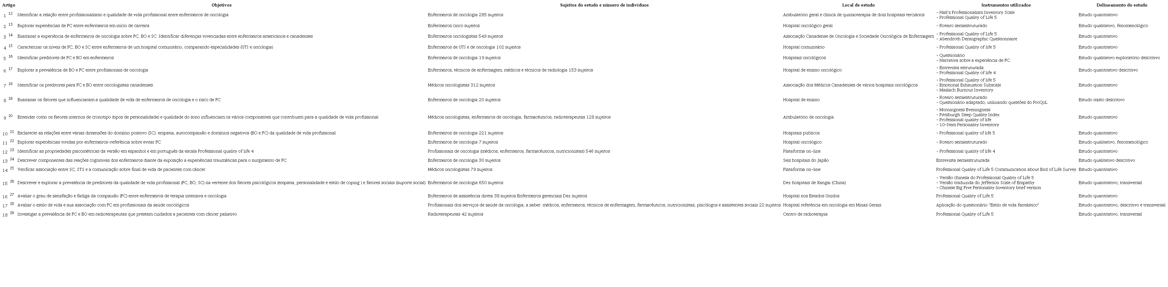 Quanto aos critérios de inclusão, selecionaram-se estudos primários, nos idiomas português, inglês e espanhol, relacionados à qualidade de vida profissional de profissionais de saúde, segundo os critérios de FC e SC na área oncológica. Excluíram-se estudos que não envolviam seres humanos, aqueles realizados com estudantes da área de saúde, os que envolviam cuidadores informais, pacientes ou familiares, e aqueles envolvendo profissionais que atuavam em pediatria.