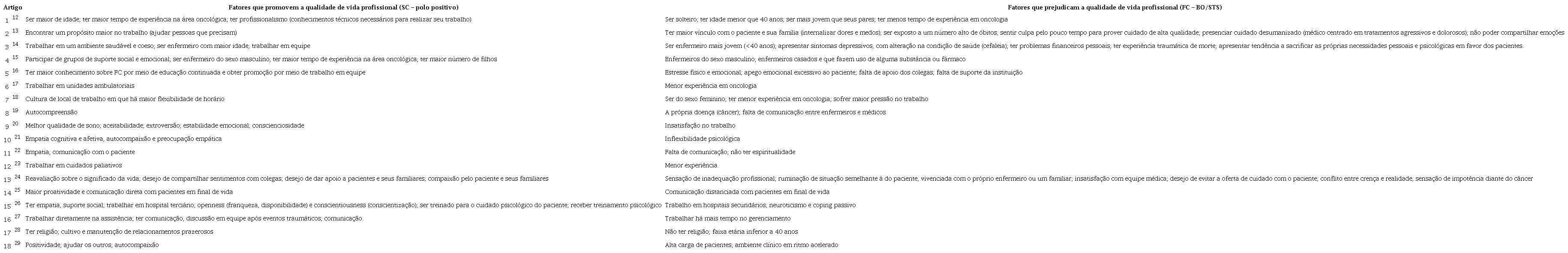Esses fatores foram categorizados em variáveis sociodemográficas, fatores internos e fatores externos, e estes foram relacionados a construtos e/ou domínios ligados à qualidade de vida profissional. Destacou-se que, nos estudos primários, os pesquisadores utilizaram análise estatística simples.