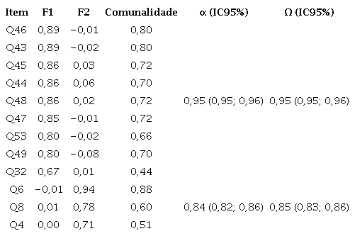 A confiabilidade foi calculada por meio do alfa de Cronbach (α) e do ômega de McDonald (Ω). Foram considerados ideais valores entre 0,70 e 0,90, com intervalo de confiança de 95% para ambos 9 . As análises foram realizadas com o auxílio do programa R.