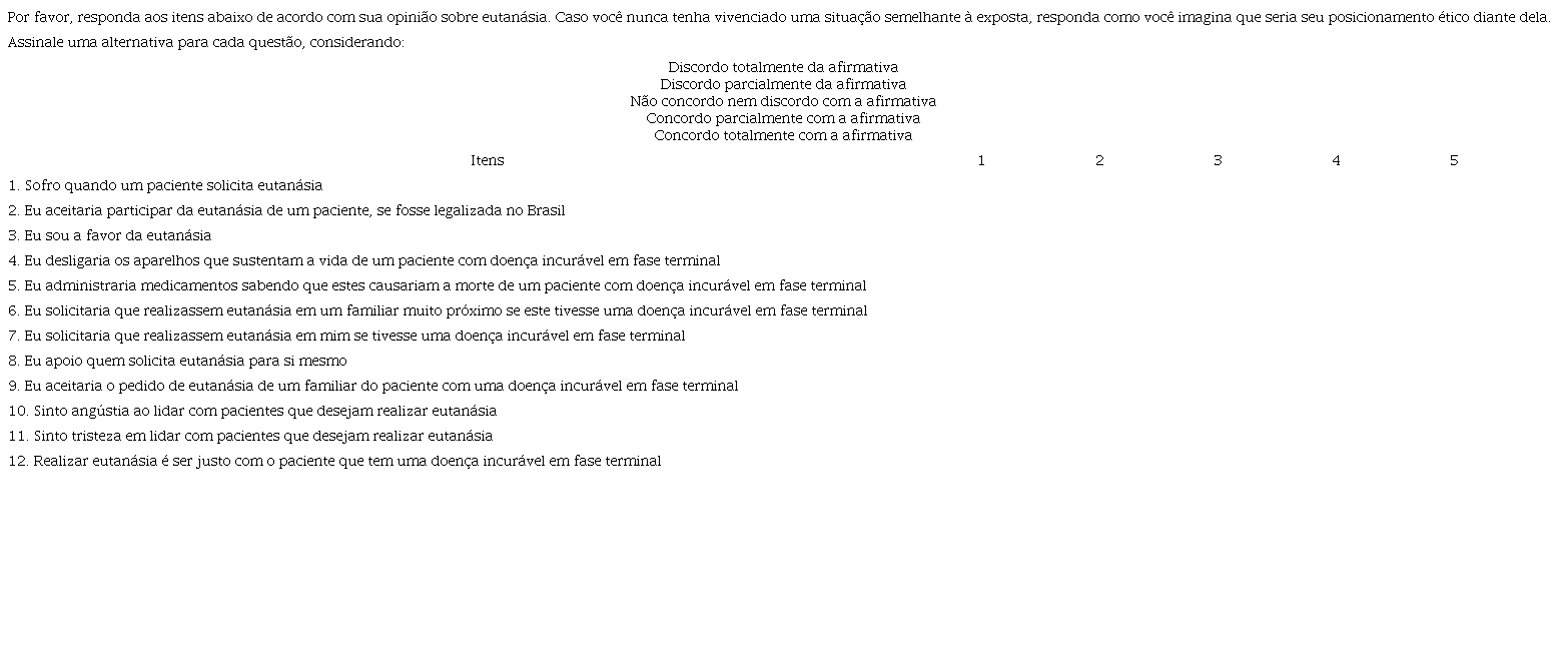 O único estudo nacional identificado sobre o tema foi uma dissertação de mestrado datada de 1986, em que a pesquisadora criou e testou algumas propriedades de um instrumento denominado Escala de Atitude sobre Eutanásia 17 em um grupo de médicos e advogados. Porém, pelo fato de mudanças sociais significativas terem acontecido desde aquele período, os itens que compunham a escala não atendem às demandas do atual cenário e às inquietações contemporâneas, não permitindo, novamente, uma adequada comparação de resultados.