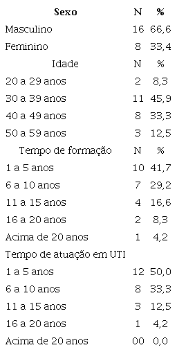 A caracterização dos participantes está apresentada na Tabela 1 e indica maioria do sexo masculino, com idade entre 30 e 49 anos e tempo de formação e de atuação em UTI de um a dez anos.