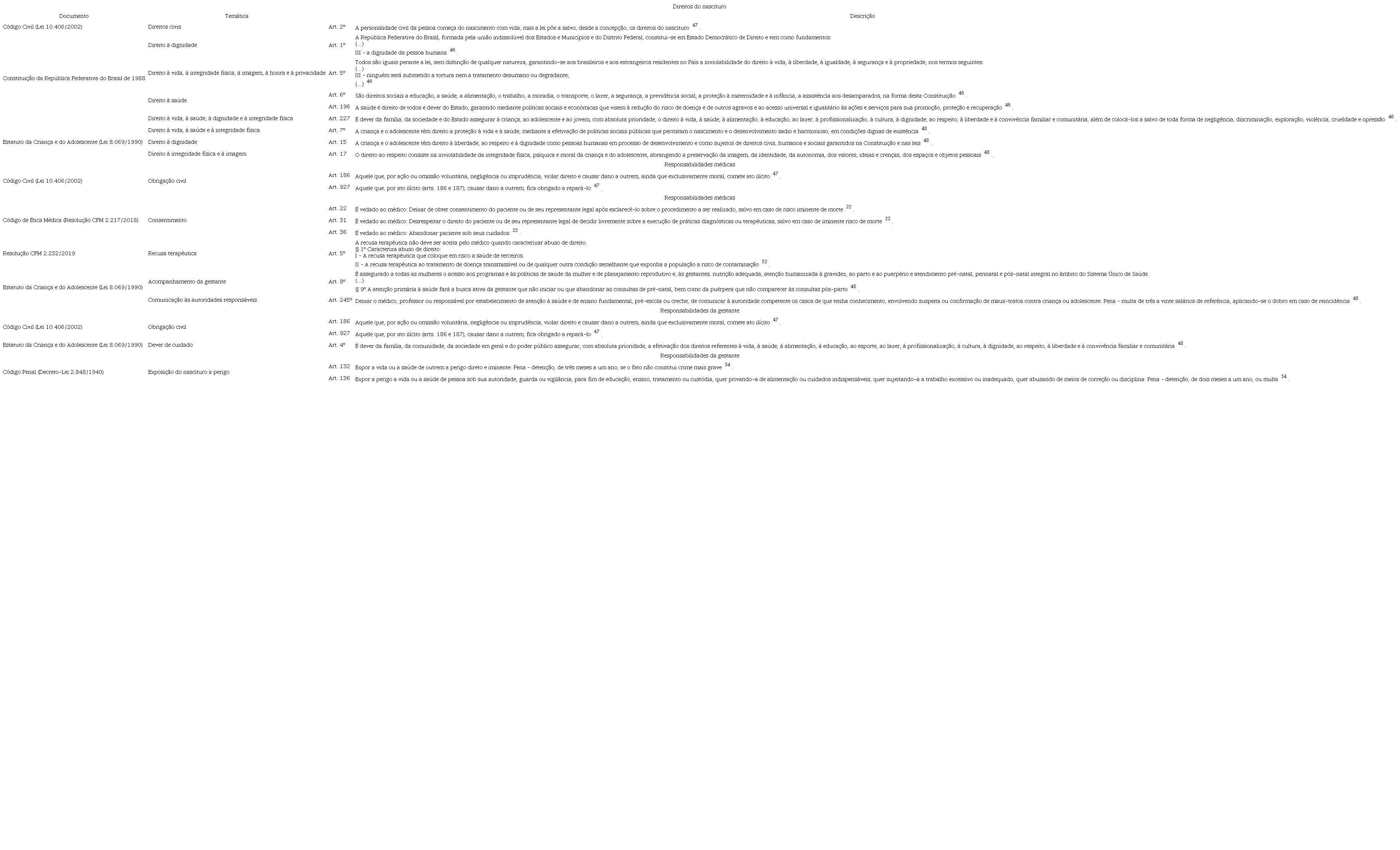 O Quadro 1 sintetiza os direitos do nascituro e a responsabilidade médica e materna de acordo com a legislação brasileira.