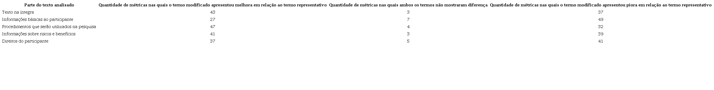 Os resultados expressos na Tabela 2 indicam que a melhora do termo modificado em relação ao termo representativo não foi constante, tendo havido melhora em alguns parâmetros e piora em outros, quando os respectivos textos foram avaliados com base nos blocos de informações.