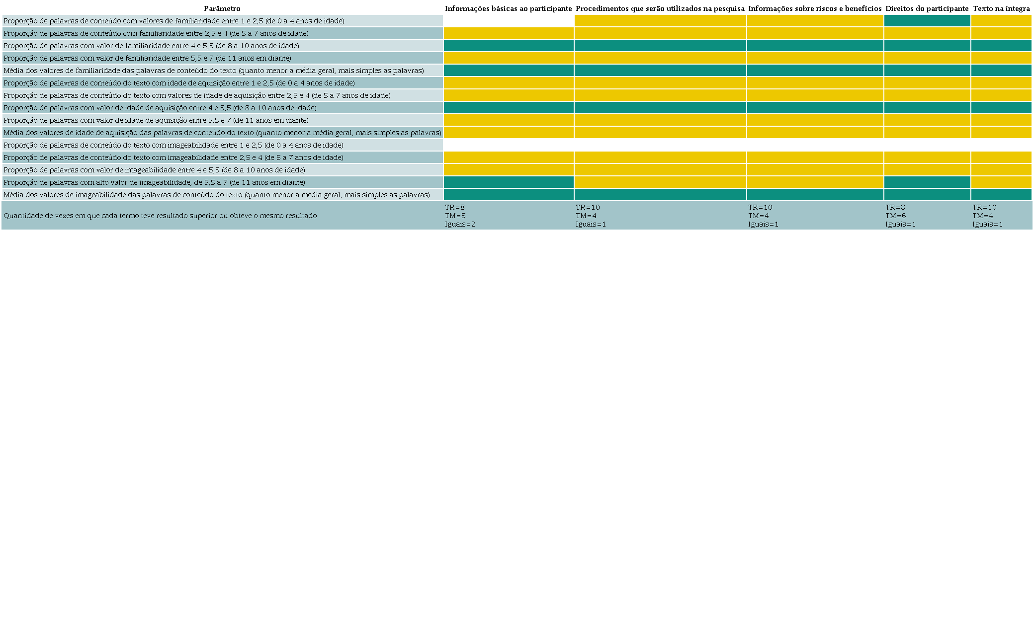 O Coh-Metrix 25 tem sido validado em publicações para avaliar textos com finalidades específicas. Este estudo não teve a pretensão de propor a validação dessa ferramenta para analisar a adequação dos textos dos dois TCLE, mas sim de ser uma primeira abordagem das características das palavras, sentenças e da relação entre as ideias que estão contidas nesses documentos.
