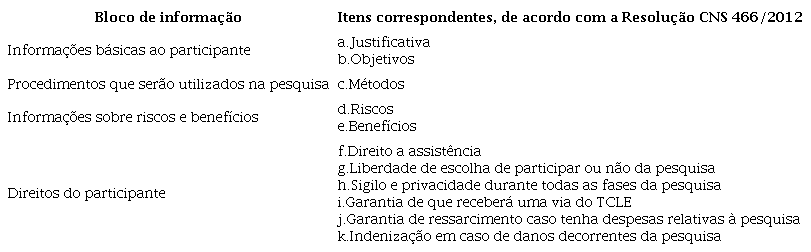 A análise foi feita de duas maneiras distintas. Primeiro, analisaram-se os textos na íntegra; em seguida, os textos foram separados em quatro blocos de informações ( Quadro 1), alinhadas com a Resolução CNS 466/2012 8. A separação em blocos foi feita para verificar se haveria uma classe de informações mais complexa. Considerou-se melhora ou piora a comparação do dado bruto de ambas as análises, sem teor classificatório ou de parâmetros.
