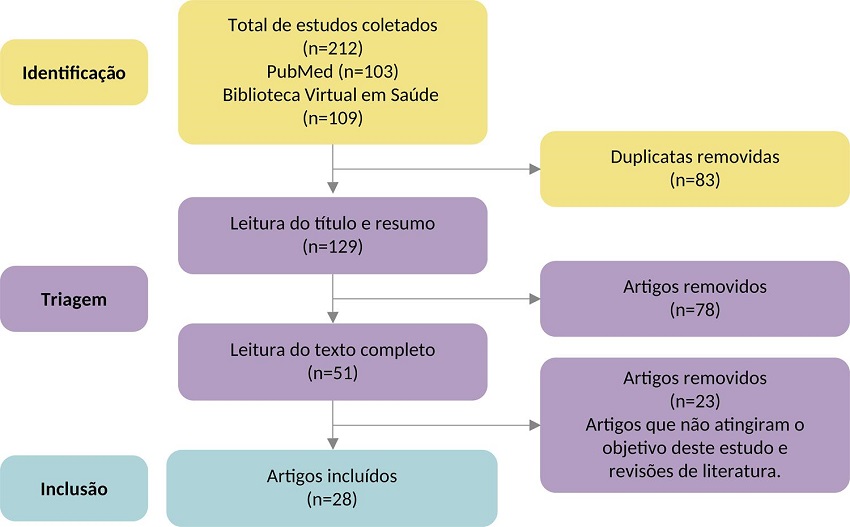 A busca inicial nas plataformas de pesquisa identificou 212 publicações com base no título, sendo 103 artigos encontrados no PubMed e 109 na BVS. Desses, 83 foram eliminados por estarem duplicados e 101 por não estarem relacionados ao tema de interesse (com base no título, resumo e leitura do texto completo). Assim, foram selecionados 28 estudos para compor esta revisão ( Figura 1 ).