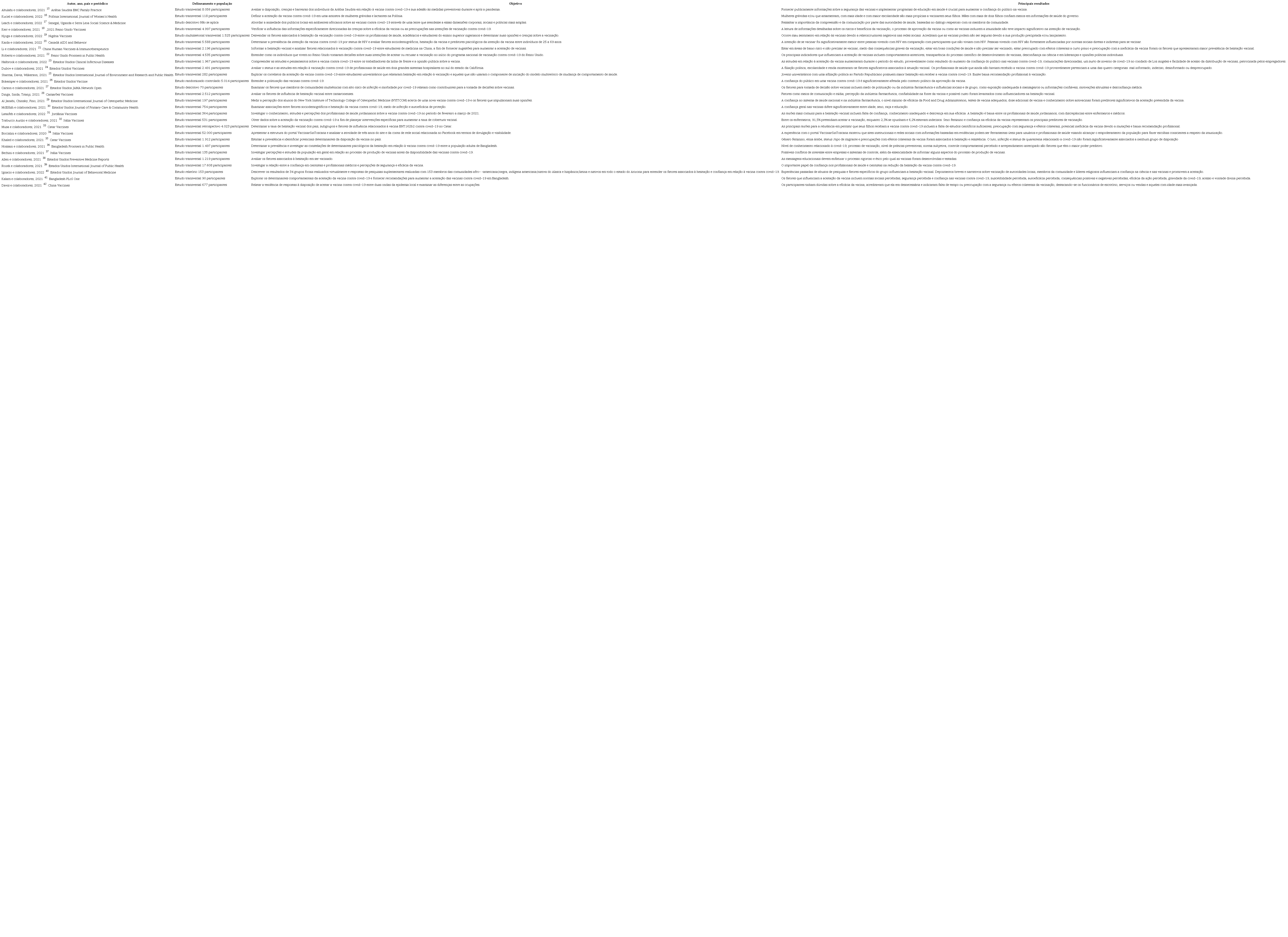 As publicações contempladas nesta revisão foram sintetizadas no Quadro 1 , de acordo com o primeiro autor e ano de publicação, país, título, periódico, objetivo e principais resultados de interesse. Todos os artigos foram publicados em inglês e em sua maioria eram transversais (24); os demais eram descritivos, randomizados controlados e relatórios (4).