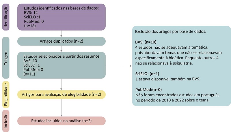Foram utilizadas as bases de dados PubMed, Biblioteca Virtual em Saúde (BVS) e SciELO. A busca realizou-se com base nos Descritores em Ciências da Saúde (DeCS). Utilizaram-se como descritores e operadores booleanos os termos “ética or bioética or ética médica and psiquiatria”, e fez-se a seleção de artigos brasileiros em língua portuguesa do período de 2012 a 2022.