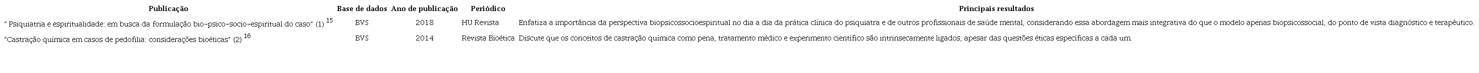 Merece atenção a escassez de estudos científicos indexados sobre o tema “bioética e psiquiatria” nas bases de dados pesquisadas, ainda mais quando se leva em consideração que foram utilizados descritores amplos para as buscas em três bases de dados relevantes.