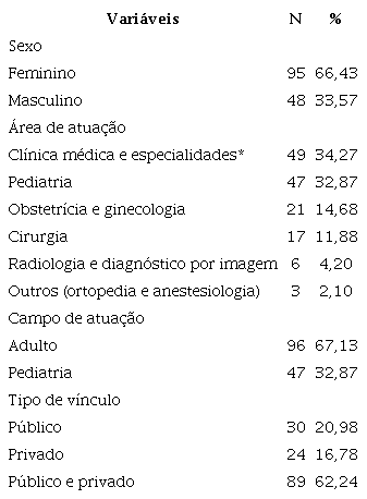 Os questionários foram aplicados a 143 profissionais de medicina, atuantes na assistência em diferentes áreas, especialidades e estados brasileiros. A idade média dos profissionais foi 45,2±11,73 anos, variando entre 24 e 73 anos, com tempo de atuação de três meses a 47 anos, sendo a média de 18,2±11,8 anos. As características gerais dos entrevistados estão apresentadas na Tabela 1 .