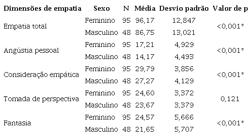 Um dos fatores sociodemográficos que apresentou diferença significativa, com p <0,01, foi o sexo. Constatou-se diferença em quase todas as dimensões de empatia, com as mulheres pontuando substancialmente mais do que os homens nas medidas de angústia pessoal e fantasia. Não há, entretanto, diferença na dimensão tomada de perspectiva ( Tabela 2 ), o que se correlaciona aos achados de Davis 15 .