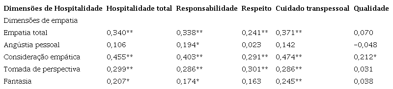 Na avaliação da relação da empatia total e suas dimensões com hospitalidade total e suas dimensões enquanto valores éticos para prática profissional ( Tabela 3 ), houve correlação de empatia total com todas as dimensões de hospitalidade, exceto qualidade. Tal dimensão abarcaria características mais técnicas, como competência, conhecimento científico e autonomia profissional, que dizem respeito às qualidades dos profissionais e do serviço relacionado, não diretamente relacionadas ao paciente. Por outro lado, consideração empática correlacionou-se com todas as dimensões de hospitalidade, inclusive qualidade, demonstrando que, para profissionais da medicina, essa dimensão é eticamente importante e se associa à qualidade do cuidado.