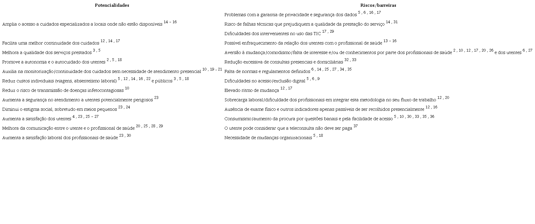 Iremos centralizar a nossa atenção na teleconsulta, cujos principais riscos e potencialidades se sumarizam no Quadro 1 , entendida como a interação síncrona entre o utente e o profissional de saúde utilizando qualquer forma de telecomunicação (telefone, telemóvel, plataformas que permitem videoconferência/videochamada), sem realização de exames clínicos e sem a obrigatoriedade de presença de um segundo profissional de saúde 2 , 9 - 11 . Essa decisão tem três razões centrais: 1) o aumento exponencial da utilização da teleconsulta 12 ; 2) os desafios éticos que tal utilização sustenta 13 ; bem como 3) o facto de os estudos realizados no campo da teleconsulta se focarem mais nos aspetos formais, como proteção de dados e consentimento informado 14 , do que nos (multi)relacionais.
