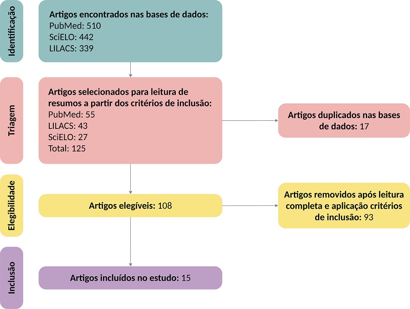 A busca com os DeCS encontrou 1.291 artigos, sendo 510 no PubMed, 442 no SciELO e 339 na LILACS. Na segunda etapa, com base nos primeiros critérios de inclusão, o quantitativo foi reduzido a 125 artigos, dos quais 17 estavam duplicados e 108 foram elegíveis para o estudo. Após leitura e apuração, foram selecionados 15 estudos.
