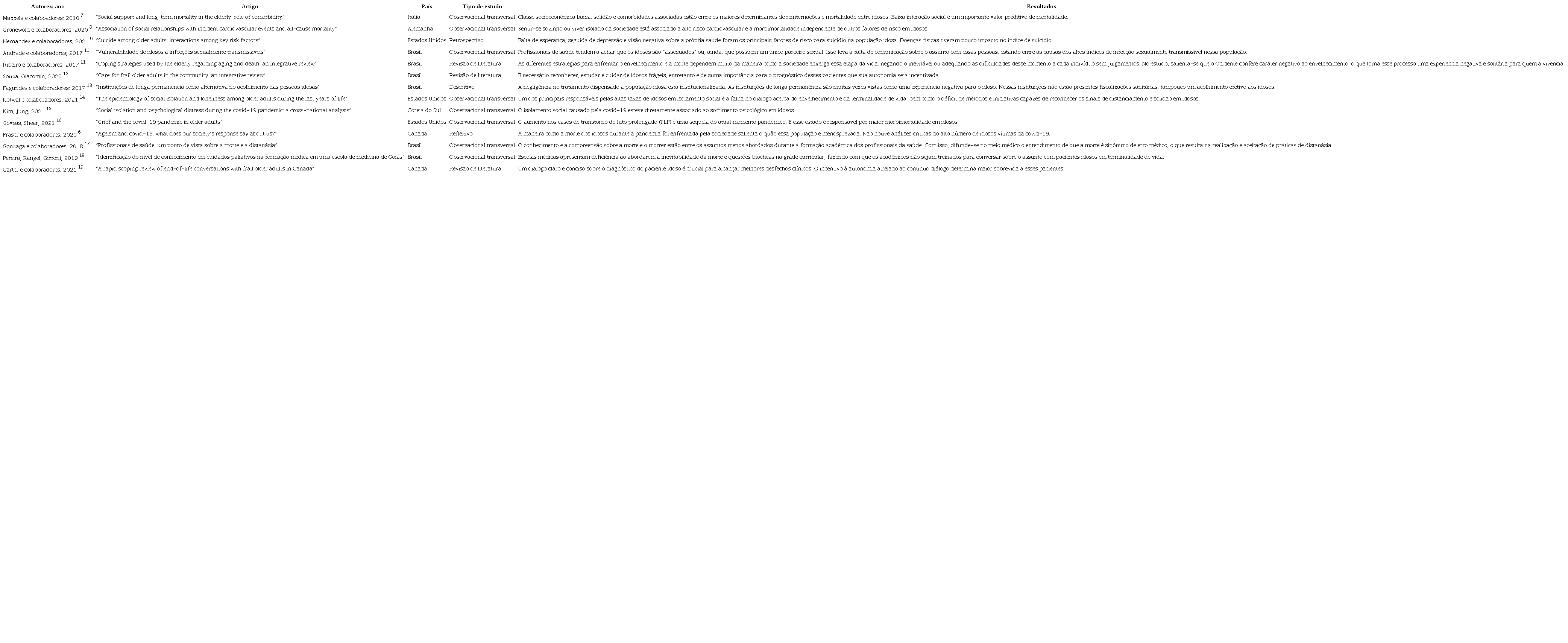 Os critérios de inclusão foram: artigos científicos completos ou revisões de literatura com acesso público, nacionais e internacionais; nos idiomas português, inglês ou espanhol; publicados entre 2010 e 2021. Para confirmar a inclusão, os artigos deveriam também abordar pelo menos um dos seguintes temas: morte social da população idosa; morte social da população idosa salientada em tempos de pandemia; e/ou negligência dos cuidados em saúde com a população idosa. Os critérios de exclusão foram: artigos que não estivessem dentro do tema proposto e resumos sem acesso ao texto completo.
