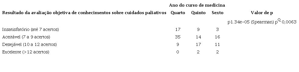 Quanto à análise objetiva do conhecimento sobre CP, 29 (21,5%) tiveram resultado insatisfatório (até sete acertos), 65 (48,1%) aceitável, 37 (27,4 %) desejável e quatro (3%) excelente. Os resultados em relação ao ano dos acadêmicos demonstraram diferença estatística significativa, apesar de fraca (p=1.34e-05), e variáveis dependentes (p=0,0063). A análise direta dos resultados de acadêmicos que fizeram internato do idoso versus os que não fizeram também demonstrou diferença estatística significativa e fraca (p<2.2e-16). Os valores dos resultados referentes a cada ano e ao internato em saúde do idoso estão nas tabelas 1 e 2.