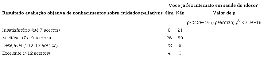 O resultado também depende da realização ou não do internato em saúde do idoso, disciplina com a qual apresenta correlação estatística, e foi melhor entre aqueles que já a cursaram. Entre os 29 resultados insatisfatórios, 21 foram de acadêmicos que não fizeram o internato, e dos 37 resultados desejáveis, 28 são de estudantes que já passaram por ele. Todos os que acertaram as 14 questões já haviam concluído o internato em saúde do idoso.