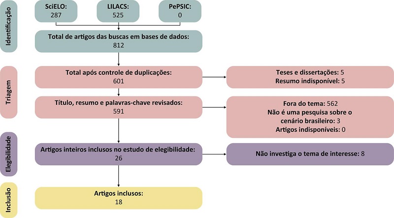 Dos 591 artigos restantes, 562 estavam fora do tema e três não se adequavam ao contexto geográfico definido para a pesquisa (Brasil) – por esse motivo, também foram excluídos. Na etapa da elegibilidade (após leitura integral), oito artigos foram removidos, restando 18 artigos para realização da revisão de escopo. A Figura 1 representa o fluxograma de seleção de artigos.
