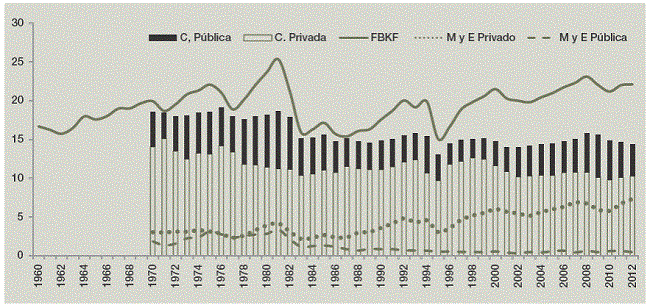 El liderazgo de la formación bruta de capital fijo en términos del producto en todo el periodo fue el gasto de la construcción, el cual, sin embargo, descendió en las últimas décadas (con promedios de 18% en el ISI y 14% en el periodo neoliberal), ocurriendo lo contrario con el gasto de la maquinaria y equipo que, en promedio osciló entre 4 y 6% del PIB, respectivamente (cuadro 3).