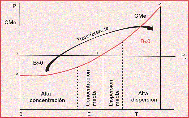 Si por razones de interés público, el regulador establece un precio uniforme, PU mayor que el coste unitario en las zonas de elevada y media concentración que en su conjunto engloban a la población situada entre 0 y E, el beneficio de los operadores es positivo (B>0), constituyendo así las áreas rentables del negocio. Por el contrario, en las regiones de población dispersa, situadas entre E y T, que representa el total de los consumidores, los costes medios superan al precio uniforme y, en consecuencia, los operadores incurren en pérdidas (B<0).