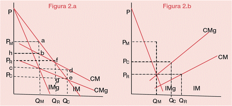 Si los costes medios de la industria son decrecientes (Figura 2.a), como asume la teoría para el caso del monopolio natural, en la solución de monopolio, donde los precios y la cantidad son, respectivamente, PM y QM, la industria obtiene beneficios representados por el área PMabh. Si el objetivo del regulador es la universalización del servicio, entonces deberá aplicarse un precio menor. En el equilibrio competitivo, el precio y la cantidad son, respectivamente, Pc y Qc. La reducción del precio y el consiguiente incremento de la cantidad aumentan el excedente del consumidor y anulan el coste social inducido por la situación monopolística. Sin embargo, esta solución competitiva provoca una pérdida para la industria equivalente al área cdePc . La financiación de esta pérdida a través del presupuesto público tiene un potencial efecto redistributivo, más acentuado cuanto mayor sea la proporción de consumidores de baja capacidad adquisitiva entre las cantidades de servicio correspondientes a las soluciones de monopolio y de libre concurrencia.