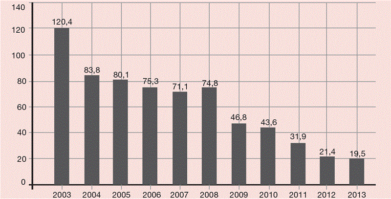 La Figura 3 muestra la evolución, claramente descendente, del coste neto del servicio universal, desde 120,4 millones de euros en 2003 a 19,5 millones de euros en 2013. La operación de las economías de escala y de las economías de red junto a la evolución tecnológica y las modificaciones en la demanda de servicios son variables que pueden estar detrás de este descenso de dicho coste.