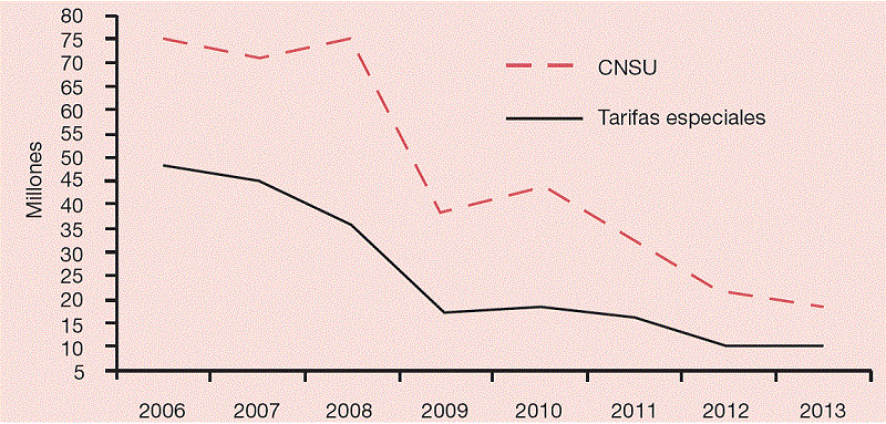 Al igual que el CNSU, el coste imputable a las tarifas especiales o abono social ha experimentado un fuerte descenso entre los años 2006 y 2013, como muestra la Tabla 5. Es de resaltar que fue durante los años centrales de la crisis económica cuando la caída fue mayor. La Figura 4 muestra la tendencia de ambas magnitudes.