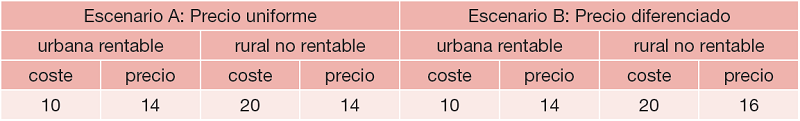 Como ya se indicó, el elevado coste de las infraestructuras en relación con los ingresos esperados en las zonas no rentables implicaría el establecimiento de un precio que tornaría inaccesible el servicio para una parte importante de la población en dichas zonas, lo cual vulnera el principio de universalidad. En un escenario de este tipo, el regulador tiene la opción de establecer un precio uniforme cuya magnitud ha de ser tal que las pérdidas en las zonas no rentables sean compensadas por los beneficios que se han de obtener en las zonas rentables. Debe advertirse que la transferencia de renta de la que estamos hablando se refiere exclusivamente al ámbito regional, es decir, desde las zonas rentables a las no rentables, con independencia de la capacidad adquisitiva de los consumidores en una u otra zona. También debe de apuntarse que una transferencia de esta naturaleza puede tener lugar, incluso con precios no uniformes, siempre que los diferenciales de precios no reflejen los diferenciales de costes (Cremer, 2001, 15), como se muestra en la Tabla 1.