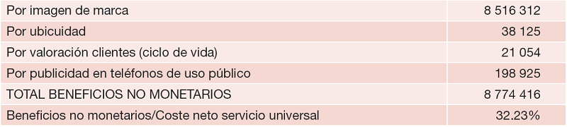 Por otra parte, el cálculo del coste neto del servicio universal incluye por el lado del ingreso la consideración de los denominados beneficios no monetarios o intangibles tales como el mayor reconocimiento de la marca del operador como consecuencia de la prestación del servicio, ventajas derivadas de la ubicuidad, valoración de los clientes o grupos de clientes, teniendo en cuenta su ciclo de vida, y ventajas comerciales que implica el tener acceso a todo tipo de datos sobre el servicio.
