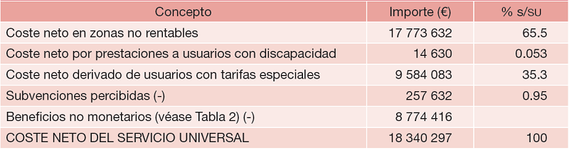 A título de ejemplo, la CNMC estableció, para el caso de España una cuantificación de los costes netos del servicio universal en el servicio telefónico especificando sus principales elementos integrantes, lo cual se muestra en la Tabla 3.
