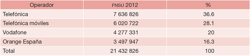 En el caso de España, el coste de las tarifas especiales o abono social ha de ser soportado por los operadores en la proporción que determine la autoridad reguladora. La Tabla 4 recoge las contribuciones de los diferentes operadores al Fondo Nacional del Servicio Universal (FNSU) español para el año 2012. Como se puede observar, el nivel de la contribución se impone, por este orden, a Telefónica, Telefónica móviles, Vodafone y Orange España.