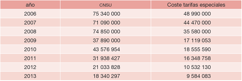Sin embargo, si ponemos atención a la evolución del coste imputable a las tarifas especiales (CNTE) que, en esencia, constituyen el abono social, elemento básico de la redistribución por razón de ingresos en este servicio, se aprecia el comportamiento que se reporta en la Tabla 5.