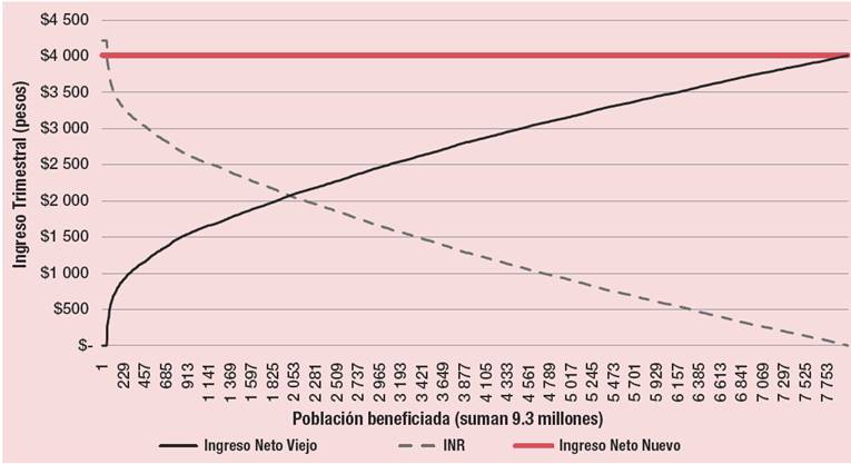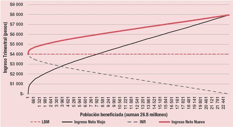 Cuando ϕ disminuye de 100 a 50%, el ingreso neto promedio aumenta 33% al pasar de 4 012 pesos por trimestre (la LBM) a 5 333 pesos por trimestre. Además, la población beneficiada aumenta 189% (al pasar de 9.3 millones a 26.8 millones) con la consecuente disminución en la desigualdad.
