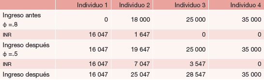 Compárense los resultados anteriores con el caso en el que φ = 50%. La primera persona recibiría un impuesto negativo de 16 047 pesos;20 la segunda recibiría 7 047 pesos;21 la tercera 3 547 pesos,22 y la última nada. Nótese que la primera persona no mejora su situación porque supusimos que su ingreso es 0; que la segunda persona recibe un INR mayor que en el caso anterior; y que la tercera persona se beneficia del esquema, cuando antes no lo hacía.