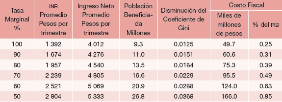 Como se indicó en la segunda sección, la tasa marginal (ϕ) fija no sólo el monto del INR que recibe cada persona -y, por tanto, su ingreso neto, sino que también determina la población beneficiada y, por ende, tanto el grado de disminución de la desigualdad como el costo fiscal. Se llevaron a cabo seis simulaciones para tasas marginales que van de 50 a 100% en incrementos de 10%.