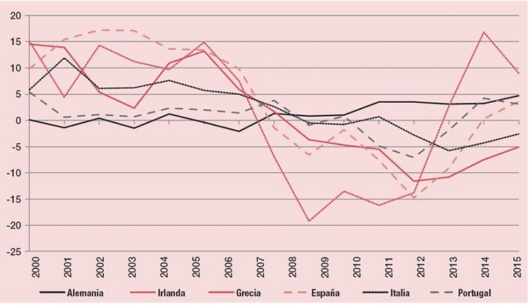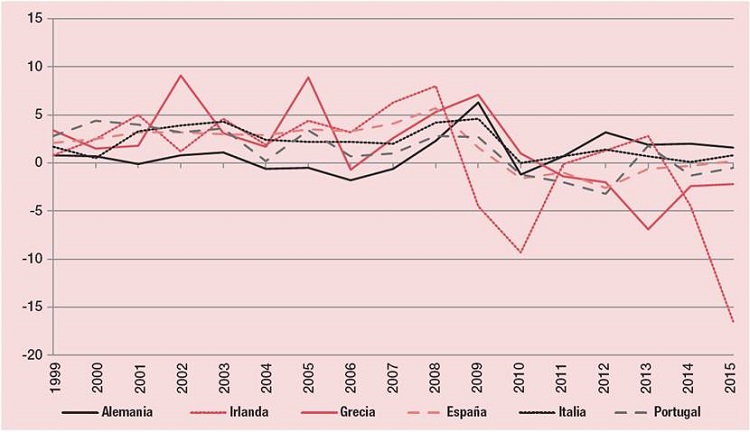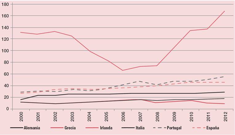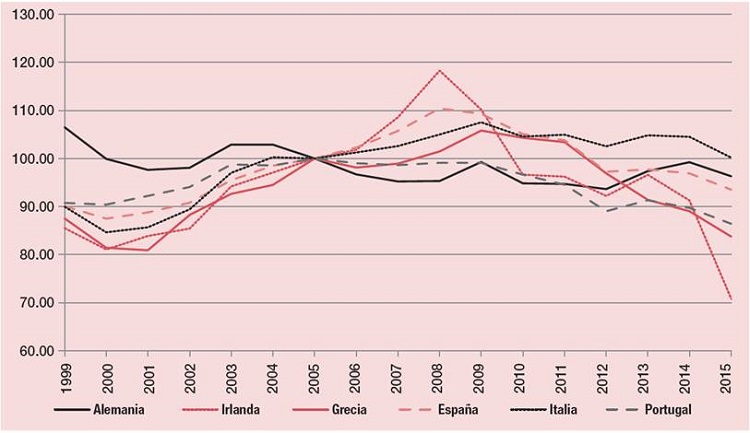 La situación competitiva de los países tuvo un comportamiento divergente desde el año 2000 y hasta 2009. Los tipos de cambio efectivos con base en los costos laborales en Irlanda, Portugal, España, Italia y Grecia se deterioraron significativamente, como se puede apreciar en la Figura 6. En cambio, en Alemania mejoraron en forma notable. Esto se debe a políticas salariales divergentes y a diferencias en el ritmo de implantación de la agenda de reformas estructurales acordadas en la Estrategia de Lisboa.