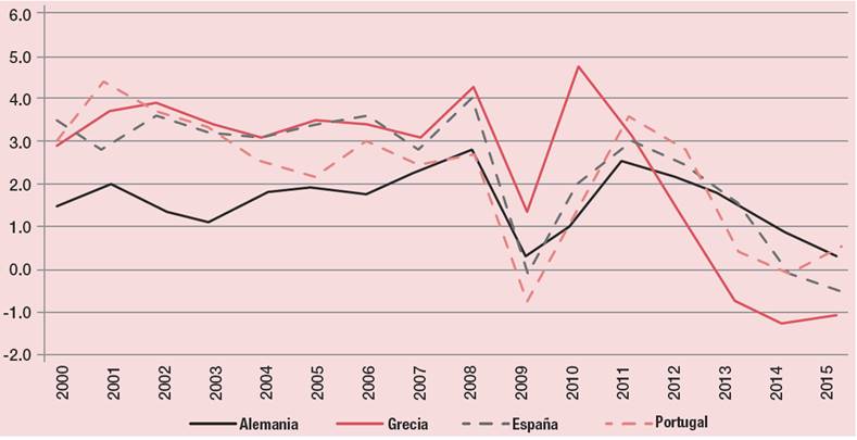 Entonces, contrariamente a lo planteado por Frankel, la creación del euro se convirtió en sí misma en un choque asimétrico de proporciones no anticipadas que pudo solventarse mientras los flujos de capital privado se mantuvieron hacia los países del sur. Una vez que disminuyeron, los precios y los costos laborales unitarios se habían situado muy por encima de los de Alemania, su referente más competitivo. Las políticas comunes y los mecanismos al alcance del Banco Central Europeo fueron insuficientes para corregir los desequilibrios acumulados. Entonces, lejos de propiciar un mayor grado de convergencia entre las economías, la creación del euro produjo el resultado contrario (Figura 7).