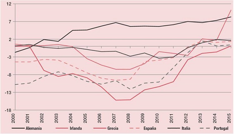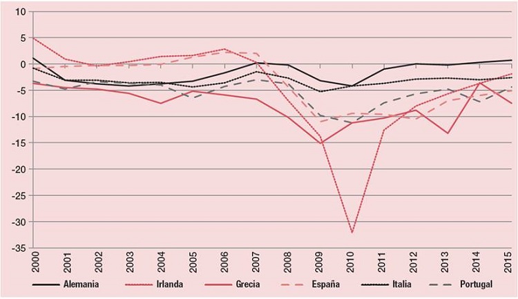 La creación del euro indujo en buena parte de los inversionistas una percepción de que los riesgos asociados con la inversión en algunos países del sur habían desaparecido. La inversión masiva de recursos provenientes de Alemania y otros países del norte de Europa en la región mediterránea provocó un auge económico y tasas inflacionarias más altas en España, Grecia y Portugal comparadas con las de Alemania (Figuras 1 y 2). Estos países del sur de Europa acumularon considerables déficit en cuenta corriente que requirieron del financiamiento externo para solventarlos (Figura 3). Contrario a lo que generalmente sucede, el origen de dichos déficit de cuenta corriente no fue la existencia de desequilibrios equivalentes en sus finanzas públicas (Figura 4), sino por el monto y la composición de los flujos de inversión extranjera directa (IED) que recibieron. Las naciones del sur atrajeron mayor proporción de IED en el sector inmobiliario (Figura 5) que en el sector productivo, mientras que en los países del norte sucedió lo contrario. Esto provocó un cambio en la composición de los stocks de capital entre los sectores de bienes comerciables y no comerciables. Los países del norte incrementaron su producción de bienes comerciables y los países del sur la de bienes no comerciables, de ahí que en los primeros la balanza comercial y la cuenta corriente mejorara, mientras que en los segundos empeorara.