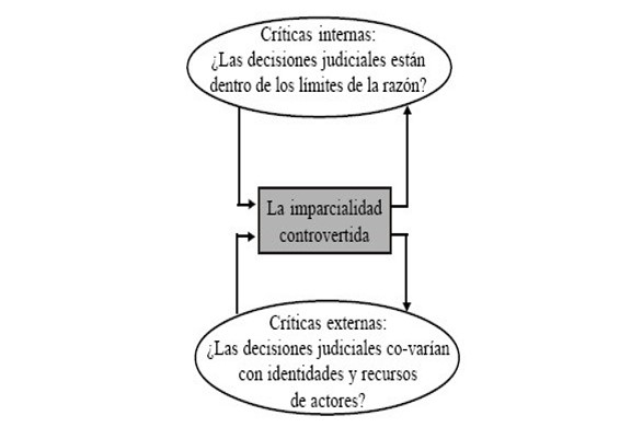 Como lo ilustra la figura 1, los dos modos de crítica jurídica pueden aparecer como fuentes de controversia acerca de la imparcialidad judicial, pero también pueden presentarse como respuestas a controversias de este tipo. Ambos pueden alimentar las dudas sobre la imparcialidad judicial, o responder a ellas. Es decir, es posible entrar en el terreno de la "imparcialidad controvertida" (el cuadro sombreado de en medio) desde cualquiera de estas perspectivas y, una vez ahí, seguir cualquier camino para corroborar las dudas iniciales. Para lograr los deseados"pesos y contrapesos" entre las dos perspectivas, podemos adoptar una sencilla regla general: si las dudas acerca de la imparcialidad judicial surgen de una crítica externa, deberíamos introducir la lógica interna de la argumentación jurídica para valorarlas; si las dudas surgen de irritaciones legales, deberíamos responder examinando las circunstancias extralegales para evaluarlas.