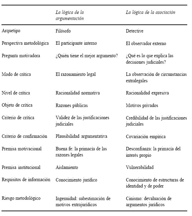 Comúnmente, los críticos del derecho adoptan o bien una perspectiva "interna" y evalúan las razones normativas que fundamentan las decisiones judiciales; o bien adoptan una perspectiva "externa" y estudian los correlatos empíricos que acompañan las resoluciones judiciales (como la ideología personal del juez, el estatus social de la parte perdedora, y los recursos materiales de la parte vencedora). Los críticos con un enfoque interno preguntan si las decisiones legales son correctas o incorrectas. Los críticos con un enfoque externo se preguntan si revelan un sesgo sistemático en favor de una u otra de las partes en conflicto. La perspectiva interna sigue lo que llamaré la lógica del razonamiento o de la argumentación: la examinación de argumentos legales. La perspectiva externa se basa en lo que llamaré la lógica de la asociación o de la covariación: la búsqueda de circunstancias extralegales que covaríen con las decisiones judiciales.