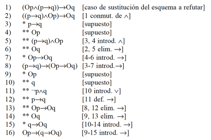Lo que afirma 16 es que si algo es obligatorio, entonces todo lo que de hecho ocurre es obligatorio. Esta consecuencia es manifiestamente inadmisible, por lo que debe rechazarse la validez del esquema del que deriva.