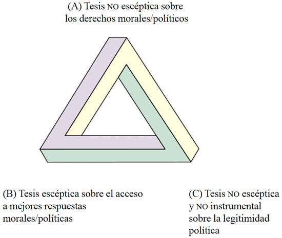 Desde el momento en que Waldron valora positivamente la capacidad epistémica de los portadores de derechos –al punto de considerarlos los únicos agentes competentes para ejercer dicho juicio, todos en igualdad de condiciones– le resulta, a mi juicio, ineludible reconocer la pertinencia del teorema de Condorcet. Y junto con ello, se debería modificar significativamente la tesis escéptica que conformaba el vértice (B) del triángulo.