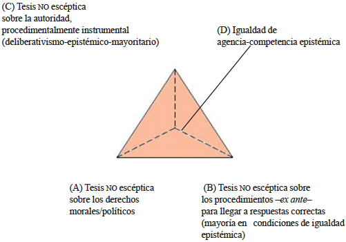 El flujo entre los puntos realiza el refuerzo mutuo entre ellos, ya que la legitimidad política es instrumental –respecto de un valor procedimental, y no sustantivo– y se apoya en un elemento que Waldron utilizaba en su construcción, pero no identificaba expresamente, como sustento de la legitimidad (“igualdad de agencia/competencia epistémica”). La incorporación de este cuarto elemento –que resulta implicado en la aceptación de la tesis (A), y conceptualmente derivado de ella– se suma a la reconfiguración no escéptica de la tesis (B) y la reconfiguración de la tesis (C) en términos de deliberativismo mayoritario, para dar lugar a esta nueva figura: