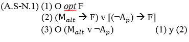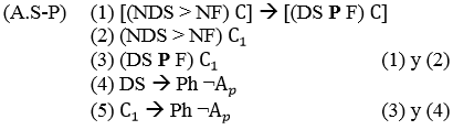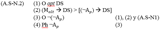 La proposición (1) representa al deber de optimizar al derecho social “DS”. La proposición (2) es una premisa empírica que indica que la medida alternativa “ ” promueve en mayor nivel al derecho social “DS” en comparación con la omisión “¬ ”. La proposición (3) es la conclusión del razonamiento de acuerdo con la cual es obligatorio no omitir en razón de (1), (2) y (A.S-N1) o, lo que es equivalente por inferencia directa en (3), que está prohibido omitir.