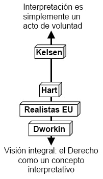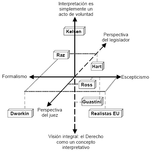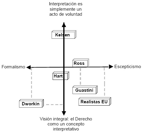 Podemos trazar ahora el primero de los planos que forman la tipología materia de esta sección. En la parte superior del eje tendríamos la postura de Kelsen, una en que la interpretación es vista simplemente como un acto de voluntad; mientras que en la parte inferior se puede colocar a Dworkin con la visión integral de que el Derecho es un concepto interpretativo. Entre los extremos tenemos a Hart y luego a los realistas norteamericanos19, como se explicó antes, cerca de Dworkin pero no a su nivel.