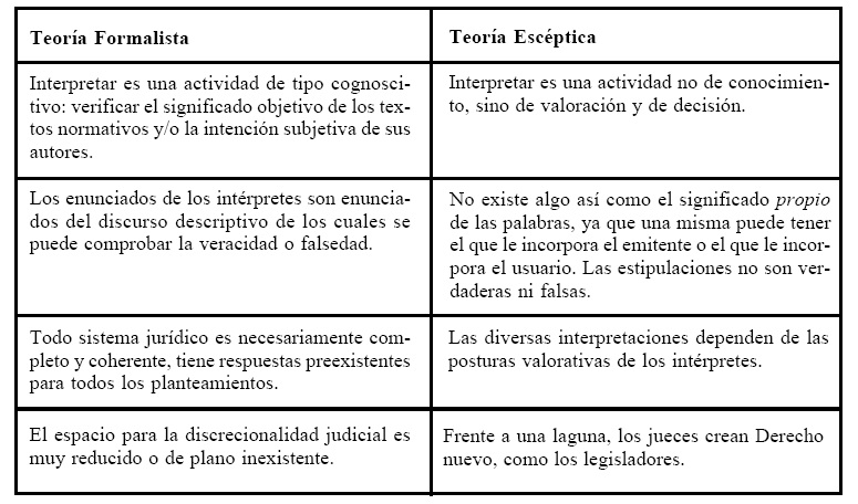 Si tuviéramos que definir sus premisas básicas, y en términos muy generales, las teorías formalista y escéptica de la interpretación se caracterizarían por lo siguiente20: