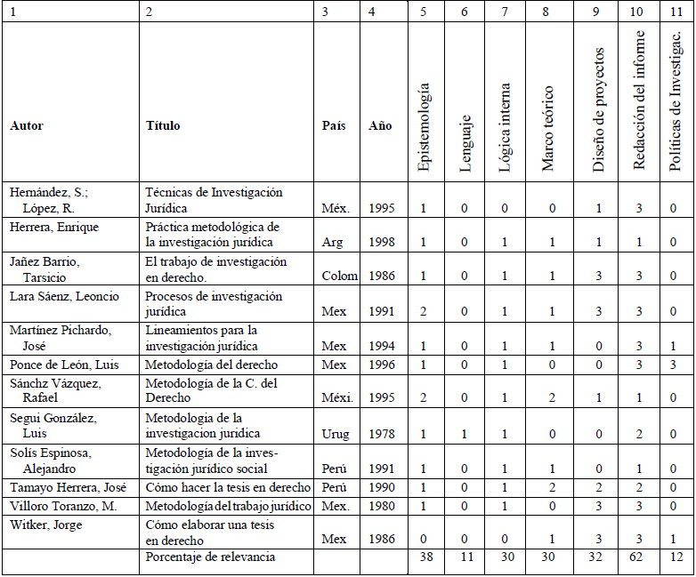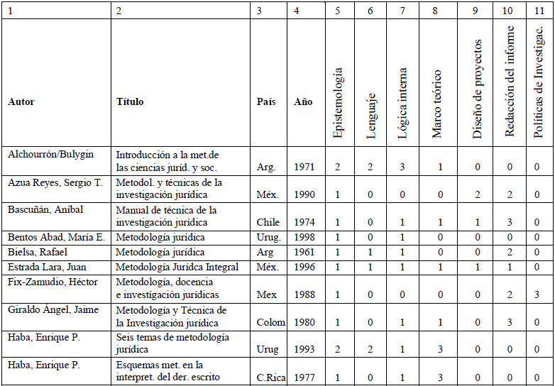 A los efectos de corroborar nuestras afirmaciones, al menos con el limitado alcance del indicador seleccionado, hemos procedido a analizar 22 libros catalogados por sus propios autores como de 'metodología de la investigación jurídica'. En ello hemos evaluado la relevancia asignada a 7 items seleccionados en conexión con nuestra hipótesis. La evaluación discrimina 4 valores: 0=ninguna referencia; 1=referencia muy general; 2=tratamiento teórico detallado; 3=tratamiento teórico detallado y ejemplos prácticos.